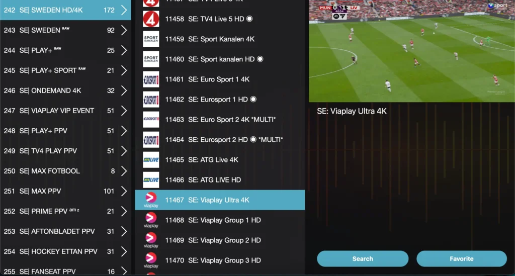 Vi erbjuder tusentals TV-kanaler från hela världen. Vi sänder sport från olika välkända tjänster och ligor. Du får även tillgång till filmer och serier från populära plattformar.
